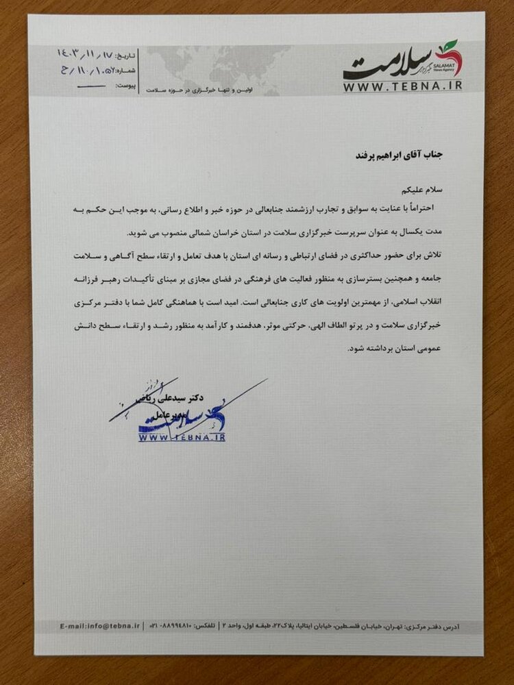 ابراهیم پرفند مدیر خبرگزاری سلامت در خراسان شمالی شد