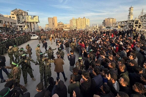 تصاویر منتشر شده از تقاطع السرایا در مرکز شهر غزه نشان میدهد که شمار زیادی از مبارزان گردانهای قسام هنگام تحویل ۳ اسیر زن اسرائیلی به صلیب سرخ حضور دارند.