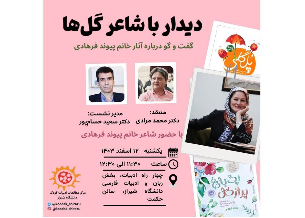 نشست دیدار با شاعر گلها روز یکشنبه ۱۲ اسفندماه از ساعت ۱۱:۳۰ در سالن حکمت دانشگاه شیراز برگزار خواهد شد و حضور علاقهمندان در این جلسه آزاد و رایگان است.
