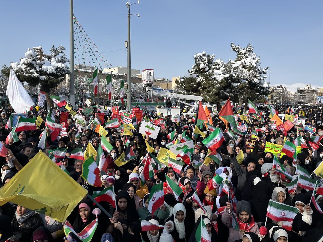 پرچمهای سه رنگ ایران اسلامی نیز در دستان راهپیمایان حال و هوای ۲۲ بهمن ۵۷ را تداعی کرده است و مردم این دیار با سردادن شعارهای استقلال، آزادی و جمهوری اسلامی، مرگ بر استعمار، مرگ بر آمریکا، تا پای جان پای نظام ایستادهایم.