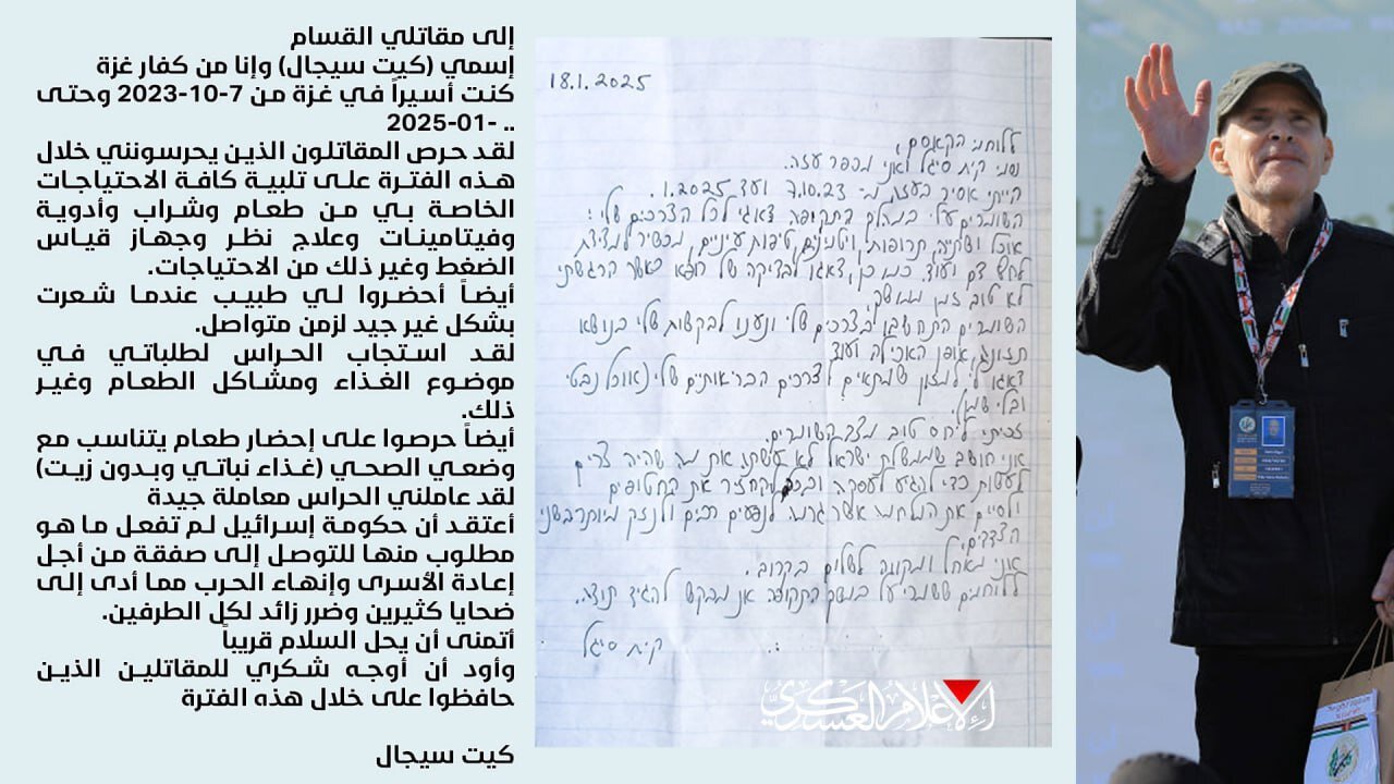 به گزارش خبرگزاری مهر به نقل از شهاب نیوز، «کیت سیگال» اسیر صهیونیست با تبعیت آمریکایی که روز گذشته از سوی گردان‌های قسام آزاد شد در پیامی از مبارزان مقاومت فلسطین به دلیل برخورد محترمانه و اخلاقی تمجید به عمل آورد.